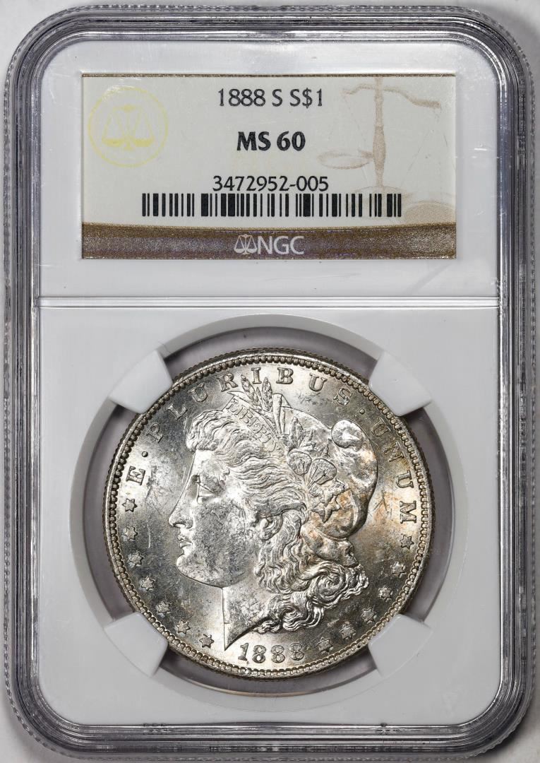 One 1888-S $1 Morgan Silver Dollar Coin NGC MS60. NGC Certified.