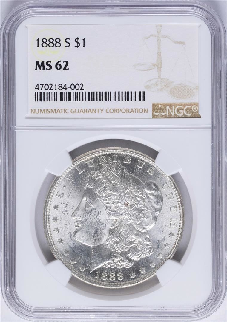 One 1888-S $1 Morgan Silver Dollar Coin NGC MS62. NGC Certified.