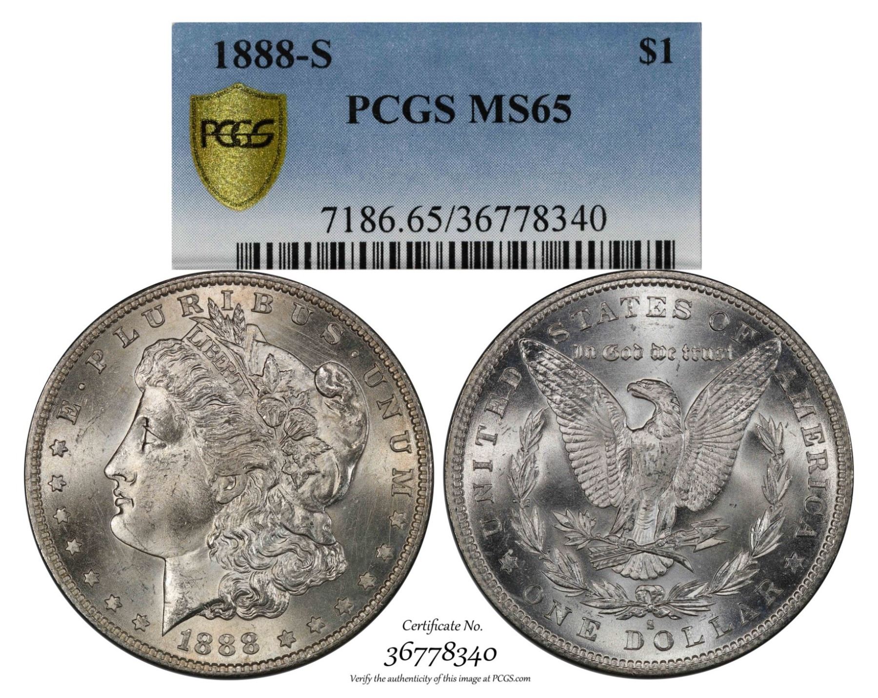 One 1888-S $1 Morgan Silver Dollar Coin PCGS MS65.