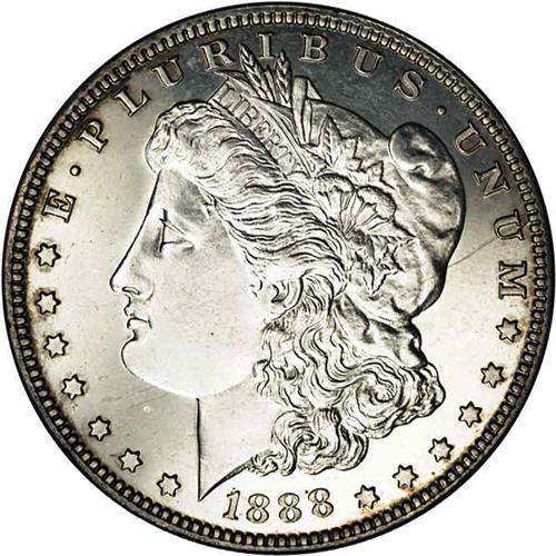 <B>1888<S$1> PR62 NGC.</B></I> Pearl gray toning complements both surfaces. Sharply struck with virtually all design features defined to full advantage save for a few hair strands above Liberty's ear. A tiny spot is noted on Liberty's cheek, and some reverse streaks, caused by the presence of planchet inclusions, are mentioned for accuracy's sake. Only 832 proof silver dollars were minted during the year. Envelope Included.