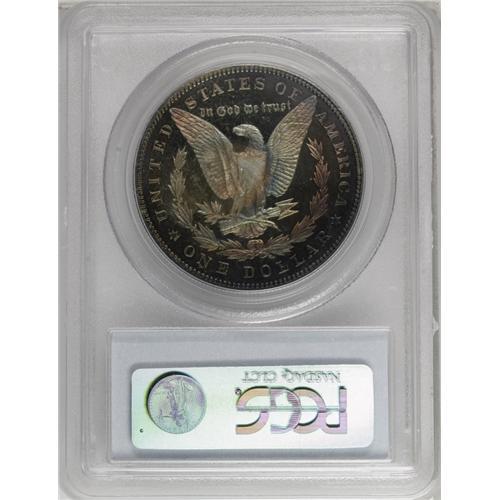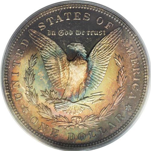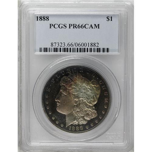 <B>1888<img border='0' src='http://www.heritagecoins.com/images/star.gif' width=10 height=10>$1> PR66 Cameo PCGS.</B></I> This is a stunning Gem with deep gold, lilac, rose, sea-green, and steel toning across nearly the entire obverse and reverse surfaces. The date on this example is doubled, with an extra serif and base visible to the left of the digit 1, and an extra outline at the lower left curve of the first 8. In his <I>Proof Encyclopedia,</B></I> Walter Breen described this "second variety" and commented that it is not listed in VAM, and that it is extremely rare.