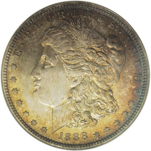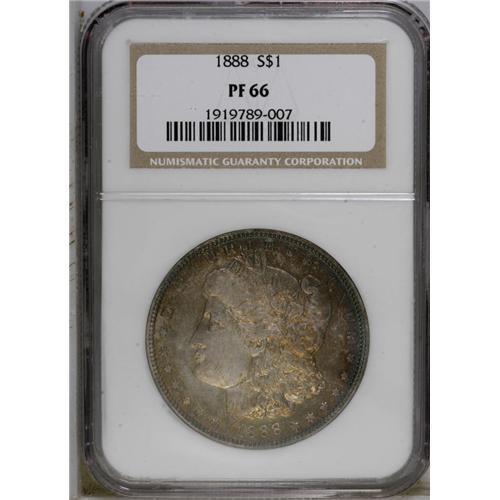 <B>1888 S$1 PR66 NGC.</B></I> Lovely obverse patination in shades of caramel, magenta, and navy-blue greets the viewer of this lovely Premium Gem, while the reverse offers similar peripheral shades and a brilliant, untoned area in the center. A suitably struck and well preserved specimen, from a mintage of only 832 proofs. Census: 16 in 66, 2 finer (3/07).<BR><BR><b>Shipping:</b> Coins & Currency (<a target="_blank" href="http://www.heritageauctions.com/common/shipping.php">view shipping information</a>)