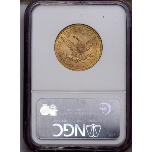 <B>1888-S<$10> MS62 NGC.</B></I> Potent luster and a precise strike combine with pleasing green-gold color and an absence of unpleasant marks to confirm the eye appeal. <BR><BR><B>Important notice:</B> Heritage usually auctions material at the rate of 200-250 lots per hour. On some occasions eBay Live bid software or the Internet may not be able to keep up with the pace of the auction. We recommend placing a realistic absentee bid now as insurance to avoid disappointment. Occasionally the auctioneer may eliminate or reject an eBay Live bid, and the auctioneer may also reopen a lot after the close of the eBay live bidding (usually because we missed an audience bid), and may reject your bid even if it shows you as the winning bidder. By bidding via eBay Live, you agree that Heritage may award the lot to another bidder at its sole discretion under the circumstances described above or any other reasonable circumstances. Since eBay bids are not shown to us until we open the lot on the floor, we treat those bids just like floor bids. In most cases the floor responds before the eBay bid is presented to us, due to Internet lag time, so for consistency we have made it a policy that floor bids are always considered first over tie eBay live bids. Also please note that all Heritage lots purchased through eBay Live carry a 20% Buyer's Premium. Please make sure you read the Terms and Conditions before you bid. This lot is being auctioned in conjunction with a live floor auction by Heritage Galleries & Auctioneers. All final auction and invoice information will be supplied by Heritage Galleries & Auctioneers, and all other information should be considered preliminary. Lot:4010 <BR><BR><B>Winning Notification and Billing:</B> After the FINAL session in this auction is complete, Heritage will send e-mail and snail mail invoices. This process normally takes several days. All final auction and invoice information will be supplied by Heritage Galleries & Auctioneers, and all other information should be considered preliminary. <BR><BR>This auction will be conducted on a live auction floor and over the Internet through eBay Live. If you choose to place an absentee bid, please take a moment to <font color='#0000ff'><u><a href='http://pages.ebay.com/liveauctions/help/before/laabsentee.html'>learn how eBay Live absentee bidding works</a></u></font><font color='#000000'>