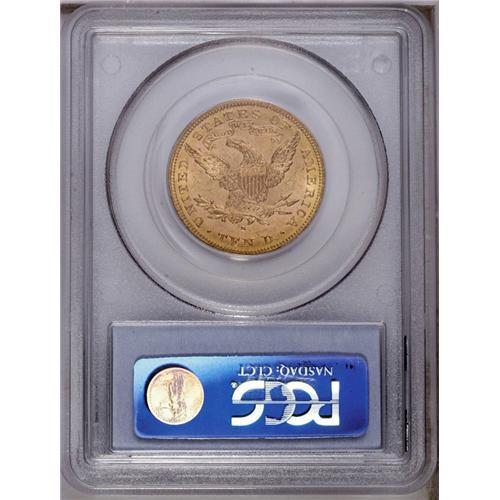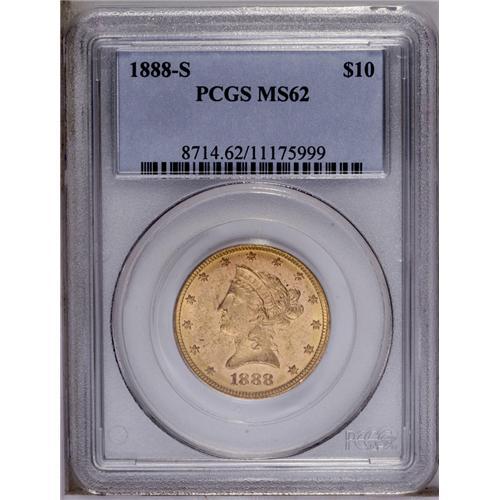<B>1888-S<$10> MS62 PCGS.</B></I> An intricately struck Liberty Motto eagle that benefits from the absence of identifiable marks. Billowy luster is most prominent near the stars and legends. <BR><BR><B>Important notice:</B> Heritage usually auctions material at the rate of 200-250 lots per hour. On some occasions eBay Live bid software or the Internet may not be able to keep up with the pace of the auction. We recommend placing a realistic absentee bid now as insurance to avoid disappointment. Occasionally the auctioneer may eliminate or reject an eBay Live bid, and the auctioneer may also reopen a lot after the close of the eBay live bidding (usually because we missed an audience bid), and may reject your bid even if it shows you as the winning bidder. By bidding via eBay Live, you agree that Heritage may award the lot to another bidder at its sole discretion under the circumstances described above or any other reasonable circumstances. Since eBay bids are not shown to us until we open the lot on the floor, we treat those bids just like floor bids. In most cases the floor responds before the eBay bid is presented to us, due to Internet lag time, so for consistency we have made it a policy that floor bids are always considered first over tie eBay live bids. Also please note that all Heritage lots purchased through eBay Live carry a 20% Buyer's Premium. Please make sure you read the Terms and Conditions before you bid. This lot is being auctioned in conjunction with a live floor auction by Heritage Galleries & Auctioneers. All final auction and invoice information will be supplied by Heritage Galleries & Auctioneers, and all other information should be considered preliminary. Lot:4012 <BR><BR><B>Winning Notification and Billing:</B> After the FINAL session in this auction is complete, Heritage will send e-mail and snail mail invoices. This process normally takes several days. All final auction and invoice information will be supplied by Heritage Galleries & Auctioneers, and all other information should be considered preliminary. <BR><BR>This auction will be conducted on a live auction floor and over the Internet through eBay Live. If you choose to place an absentee bid, please take a moment to <font color='#0000ff'><u><a href='http://pages.ebay.com/liveauctions/help/before/laabsentee.html'>learn how eBay Live absentee bidding works</a></u></font><font color='#000000'>