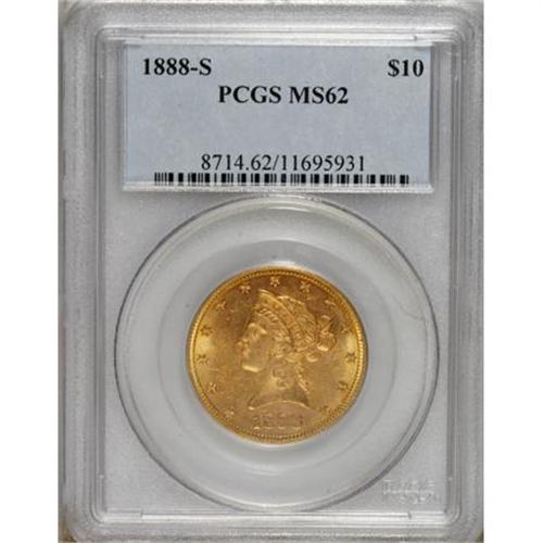 <B>1888-S $10 MS62 PCGS.</B></I> A sharply struck and lightly abraded pumpkin-gold representative of this conditionally challenging issue. Although a quantity of Mint State examples have returned from European bank holdings over the past few decades, neither NGC nor PCGS have certified any in grades above MS64.<BR><BR><b>Shipping:</b> Coins & Currency (<a target="_blank" href="http://www.heritageauctions.com/common/shipping.php">view shipping information</a>)