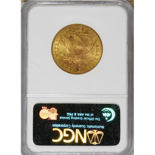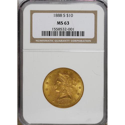 <B>1888-S $10 MS63 NGC.</B></I> The 1888-S ten dollar is relatively common through MS62. In MS63, its population drops significantly, and anything finer is virtually unobtainable. Apricot-gold surfaces reveal soft luster and wisps of light tan. Generally well struck, and with minute grade-defining marks. Census: 46 in 63, 5 finer (2/07).<BR><BR><b>Shipping:</b> Coins & Currency (<a target="_blank" href="http://www.heritageauctions.com/common/shipping.php">view shipping information</a>)