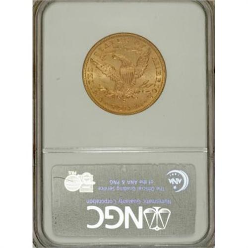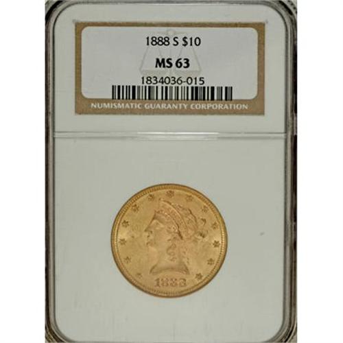 <B>1888-S $10 MS63 NGC.</B></I> This appealing Select example offers luxurious pink-gold patination over bountiful luster on both sides. The strike is robust, and there are no individually mentionable marks. NGC has graded only five coins finer (3/08).<BR><BR><B>Coin Engraver:</B> Christian Gobrecht<BR><BR><b>Shipping:</b> Coins & Currency (<a target="_blank" href="http://www.heritageauctions.com/common/shipping.php">view shipping information</a>)