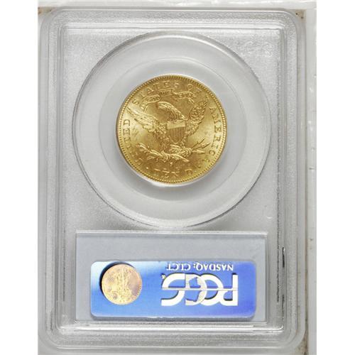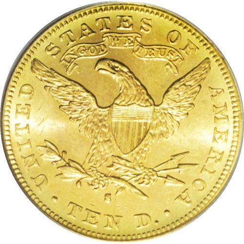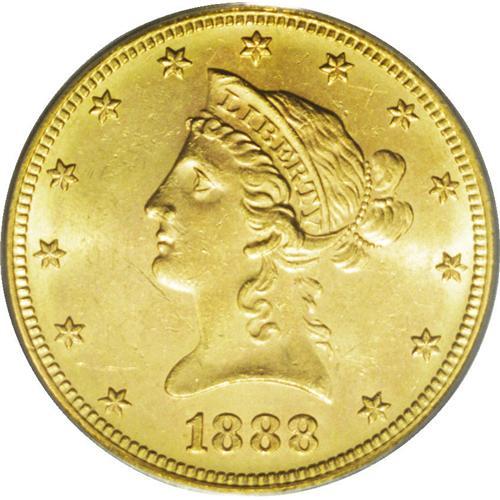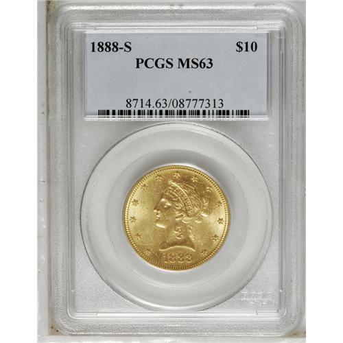 <B>1888-S $10 MS63 PCGS.</B></I> Well struck with bright mint luster and lovely coloration. The grade is derived from the small abrasions that are scattered over each side. This issue is quite scarce at the MS63 grade level, and becomes downright rare any finer. Population: 80 in 63, 2 finer (9/06).<BR><BR><b>Shipping:</b> Coin/Currency (<a target="_blank" href="http://www.heritageauctions.com/common/shipping.php">view shipping information</a>)
