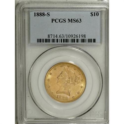 <B>1888-S $10 MS63 PCGS.</B></I> PCGS Population (89/3). NGC Census: (46/5). Mintage: 648,700. Numismedia Wsl. Price for NGC/PCGS coin in MS63: $2,500. (#8714)<BR><BR><B>Coin Engraver:</B> Christian Gobrecht<BR><BR><b>Shipping:</b> Coins & Currency (<a target="_blank" href="http://www.heritageauctions.com/common/shipping.php">view shipping information</a>\)