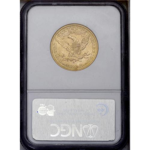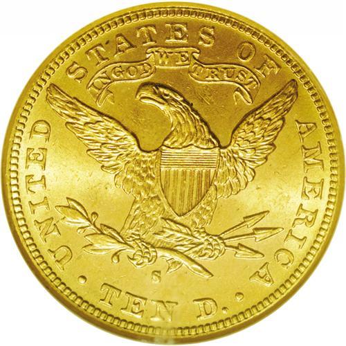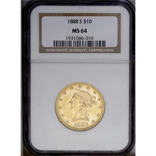 <B>1888-S<$10> MS64 NGC.</B></I> This sharply struck eagle is one of the finest extent for its date and mintmark combination. No finer examples have been certified by either PCGS or NGC. It is sharply struck and has highly lustrous yellow-gold surfaces with hints of orange color. The obverse is reflective and the reverse is frosty. Census: 5 in 64, 0 finer (3/06). <BR><BR><B>Important notice:</B> Heritage usually auctions material at the rate of 200-250 lots per hour. On some occasions eBay Live bid software or the Internet may not be able to keep up with the pace of the auction. We recommend placing a realistic absentee bid now as insurance to avoid disappointment. Occasionally the auctioneer may eliminate or reject an eBay Live bid, and the auctioneer may also reopen a lot after the close of the eBay live bidding (usually because we missed an audience bid), and may reject your bid even if it shows you as the winning bidder. By bidding via eBay Live, you agree that Heritage may award the lot to another bidder at its sole discretion under the circumstances described above or any other reasonable circumstances. Since eBay bids are not shown to us until we open the lot on the floor, we treat those bids just like floor bids. In most cases the floor responds before the eBay bid is presented to us, due to Internet lag time, so for consistency we have made it a policy that floor bids are always considered first over tie eBay live bids. Also please note that all Heritage lots purchased through eBay Live carry a 20% Buyer's Premium. Please make sure you read the Terms and Conditions before you bid. This lot is being auctioned in conjunction with a live floor auction by Heritage Galleries & Auctioneers. All final auction and invoice information will be supplied by Heritage Galleries & Auctioneers, and all other information should be considered preliminary. Lot:4014 <BR><BR><B>Winning Notification and Billing:</B> After the FINAL session in this auction is complete, Heritage will send e-mail and snail mail invoices. This process normally takes several days. All final auction and invoice information will be supplied by Heritage Galleries & Auctioneers, and all other information should be considered preliminary. <BR><BR>This auction will be conducted on a live auction floor and over the Internet through eBay Live. If you choose to place an absentee bid, please take a moment to <font color='#0000ff'><u><a href='http://pages.ebay.com/liveauctions/help/before/laabsentee.html'>learn how eBay Live absentee bidding works</a></u></font><font color='#000000'>