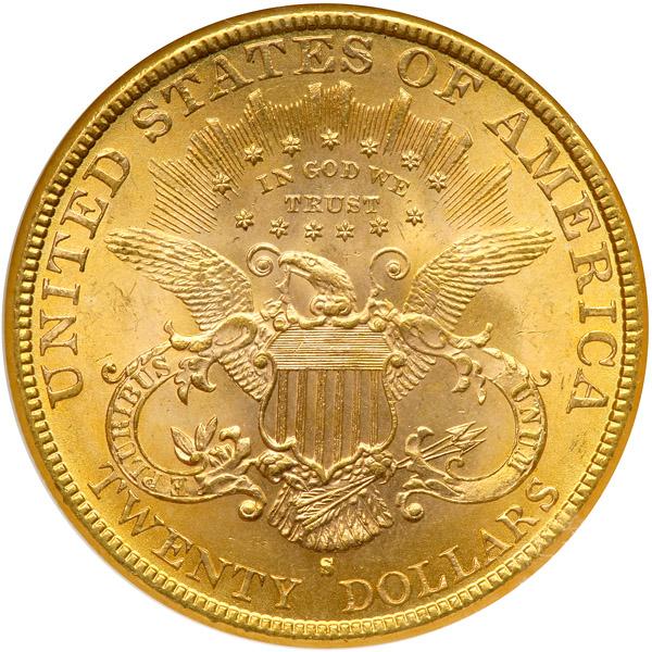 1888-S $20 Liberty. NGC graded MS-63. A very lustrous example in pinkish color gold. What is most in full view when we examine this coin is its thick, rolling mint luster -- it swirls over each side unhindered by deep abrasions and free of even a trace of deep toning. A coin of outstanding beauty and importance to the Liberty gold collector. In days of old, the luster was enough to determine a coin's status. But today, just as important is the strike: there is no deviation in the sharp relief seen, not even in the centers of the coin, and all stars are sharp (PCGS # 9009) .