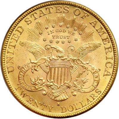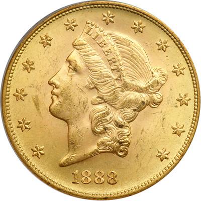 1888-S $20 Liberty. PCGS graded MS-63. Attractive golden mint bloom colors. A lustrous example whose vivid pinkish gold color undulates and billows across the surface like a mountain avalanche. We do note a few bagmarks on the face, small and unassuming, all within the narrow bounds of the MS63 grade. All stars full with central radials. Pop 319; 42 in 64, none finer (PCGS # 9009) .