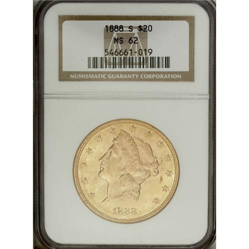 <B>1888-S $20 MS62 NGC.</B></I> The yellow-gold fields have a touch of apricot and rose. Although a number of light abrasions are present, the pleasing luster and strike are suggestive of a higher grade.<BR><BR><b>Shipping:</b> Coin/Currency (<a target="_blank" href="http://www.heritageauctions.com/common/shipping.php">view shipping information</a>)