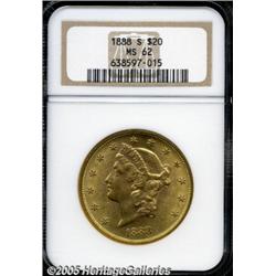 <B>1888-S $20 MS62 NGC.</B></I> This pleasing and lustrous Liberty Twenty displays green-gold borders and pumpkin-orange centers. The reverse is well preserved.