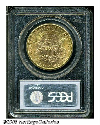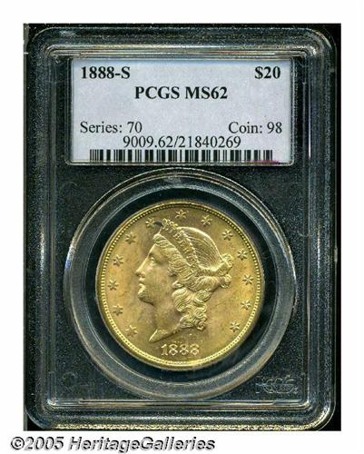 <B>1888-S<$20> MS62 PCGS.</B></I> The design elements are well struck on this S-mint double eagle, and the bright surfaces display a peach-gold patination. Several light contact marks are especially noticeable on the obverse. A dark spot is noted in the field between star 6 and Liberty's crown.