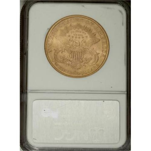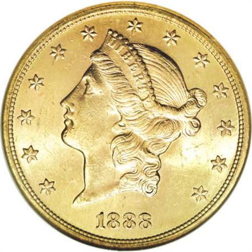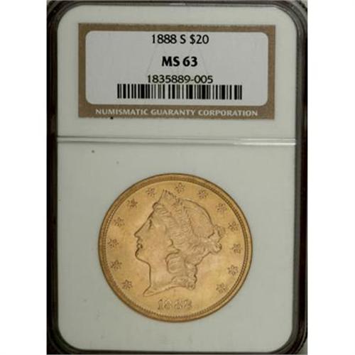 <B>1888-S $20 MS63 NGC.</B></I> This issue had a reasonably high mintage, for the era, of 859,600 pieces. It is the most common S-mint double eagle from the 1880s, and this Select example would make a good choice for type purposes. Well struck with luscious rose-gold toning and surface marks that do not seem excessive for the grade.<BR><BR><B>Coin Engraver:</B> James B. Longacre<BR><BR><b>Shipping:</b> Coins & Currency (<a target="_blank" href="http://www.heritageauctions.com/common/shipping.php">view shipping information</a>)