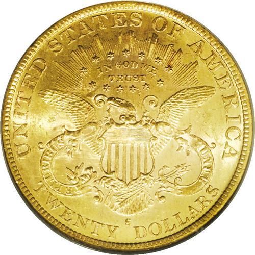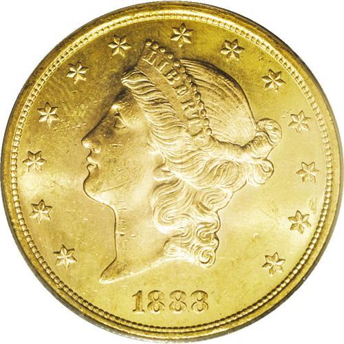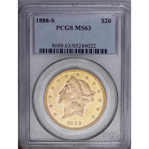 <B>1888-S $20 MS63 PCGS.</B></I> A condition scarcity in this grade, this fully struck piece has bright mint luster and attractive yellow-gold toning. Slight scuffiness on the cheek and in the left obverse field is consistent with the assigned grade, but the partially reflective luster ensures excellent eye appeal.
