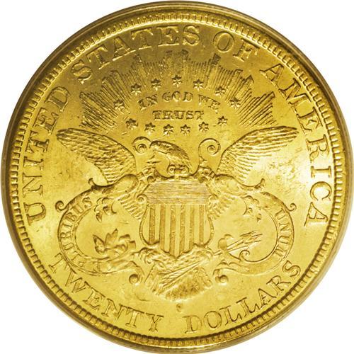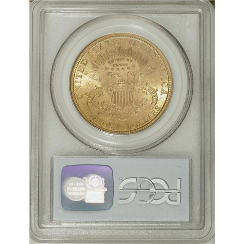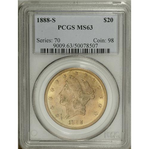 <B>1888-S $20 MS63 PCGS.</B></I> This is the optimal collecting grade for this date, in our opinion, for the certified population drops dramatically in any higher grades. PCGS has only certified 39 finer pieces, for example (10/06). This piece has brilliant yellow-gold luster with faint green highlights. A few scattered surface marks are evident on each side, typical of examples at this grade level.<BR><BR><b>Shipping:</b> Coin/Currency (<a target="_blank" href="http://www.heritageauctions.com/common/shipping.php">view shipping information</a>)