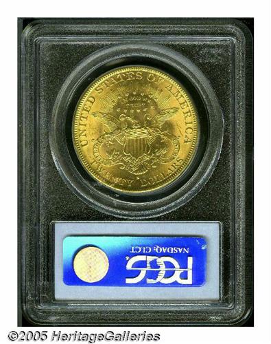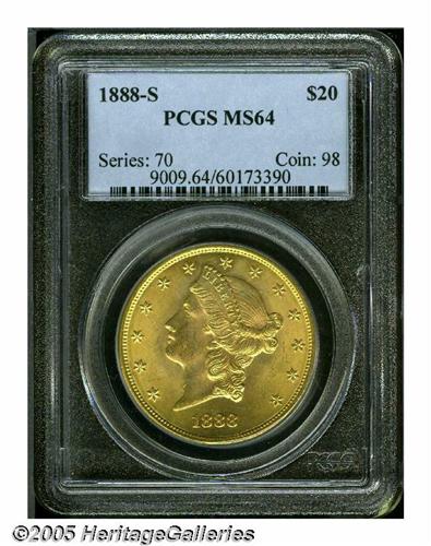 <B>1888-S<$20> MS64 PCGS.</B></I> Strong mint bloom and luster on this memorable Choice coin. The fields and Liberty's face have minor handling nicks, but this piece is far and away finer than the vast majority struck. Note the smooth, undisturbed appearance on this coin, as the naked eye will scarcely notice the minute bagmarks present. Bright orange-gold and pleasing in every way. The combined NGC and PCGS Population reports note 64 examples have been graded this high, but none have been graded higher of this date. Keep that in mind when formulating a bid.