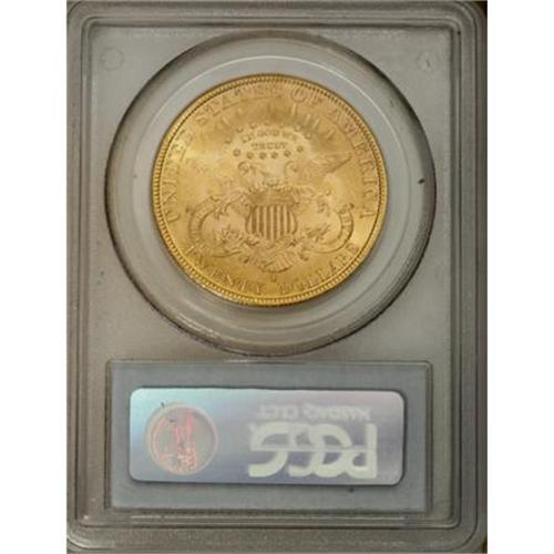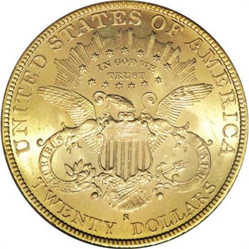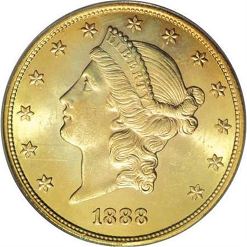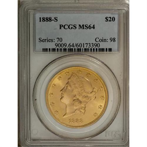 <B>1888-S $20 MS64 PCGS.</B></I> Strong mint bloom and luster on this memorable Choice coin. The fields and Liberty's face have minor handling nicks, but this piece is far and away finer than the vast majority struck. Note the smooth, undisturbed appearance on this coin, as the naked eye will scarcely notice the minute bagmarks present. Bright orange-gold and pleasing in every way. The combined NGC and PCGS Population reports note 70 examples have been graded this high to date, and one finer.<BR><BR><B>Coin Engraver:</B> James B. Longacre<BR><BR><b>Shipping:</b> Coins & Currency (<a target="_blank" href="http://www.heritageauctions.com/common/shipping.php">view shipping information</a>)