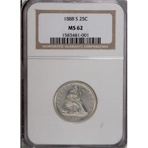 <B>1888-S 25C MS62 NGC.</B></I> NGC Census: (14/58). PCGS Population (11/46). Mintage: 1,216,000. Numismedia Wsl. Price for NGC/PCGS coin in MS62: $379. (#5521)<BR><BR><B>Coin Engraver:</B> Christian Gobrecht<BR><BR><b>Shipping:</b> Coins & Currency (<a target="_blank" href="http://www.heritageauctions.com/common/shipping.php">view shipping information</a>)