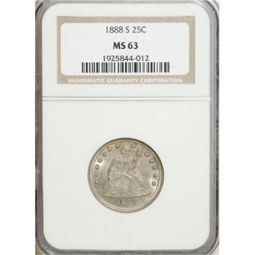 <B>1888-S 25C MS63 NGC.</B></I> A shining Select example of this late-date San Francisco Seated issue. Whispers of gold, sky-blue, and violet patina drape the lightly marked surfaces. Census: 11 in 63, 47 finer (10/07).<BR><BR><B>Coin Engraver:</B> Christian Gobrecht<BR><BR><b>Shipping:</b> Coins & Currency (<a target="_blank" href="http://www.heritageauctions.com/common/shipping.php">view shipping information</a>)