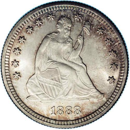 <B>1888-S<25C> MS67 NGC.</B></I> The popularity of this date among Seated Quarter collectors is unflagging due to its status as the only branch mint issue from the 1880s. While some catalogers have emphasized the rarity of the 1888-S (1.2 million pieces produced), it is actually one of the more readily obtainable issues in the entire series (per Larry Briggs, 1991). Superb quality Gems, however, are conditionally rare. Indeed, this specimen is one of just two pieces certified at this grade level by NGC; PCGS has seen no coins of this issue higher than MS66 (10/05). The present coin is sharply struck with impeccably preserved lustrous surfaces visited by whispers of golden-brown and lavender, joined by cobalt-blue on the reverse.