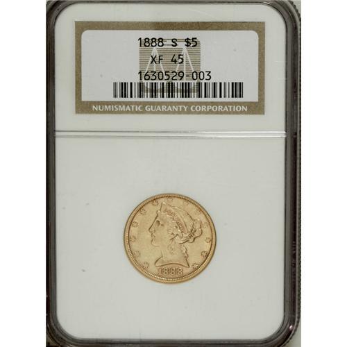 1888-S $5 XF45 NGC. NGC Census: (22/231). PCGS Pop