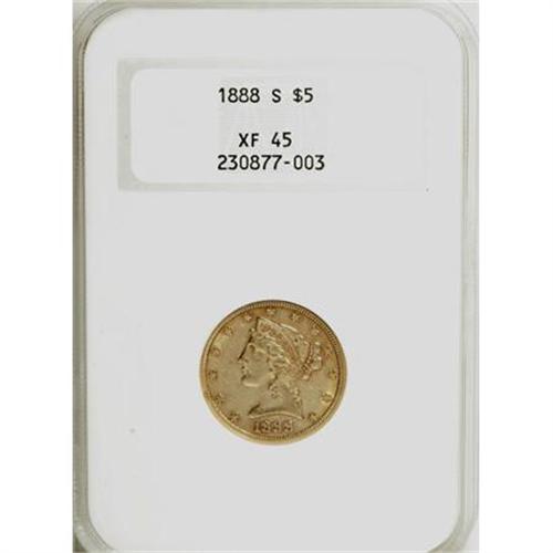 <B>1888-S $5 XF45 NGC.</B></I> NGC Census: (24/247). PCGS Population (30/151). Mintage: 293,900. Numismedia Wsl. Price for NGC/PCGS coin in XF45: $236. (#8373)<BR><BR><B>Coin Engraver:</B> Christian Gobrecht<BR><BR><b>Shipping:</b> Coins & Currency (<a target="_blank" href="http://www.heritageauctions.com/common/shipping.php">view shipping information</a>)