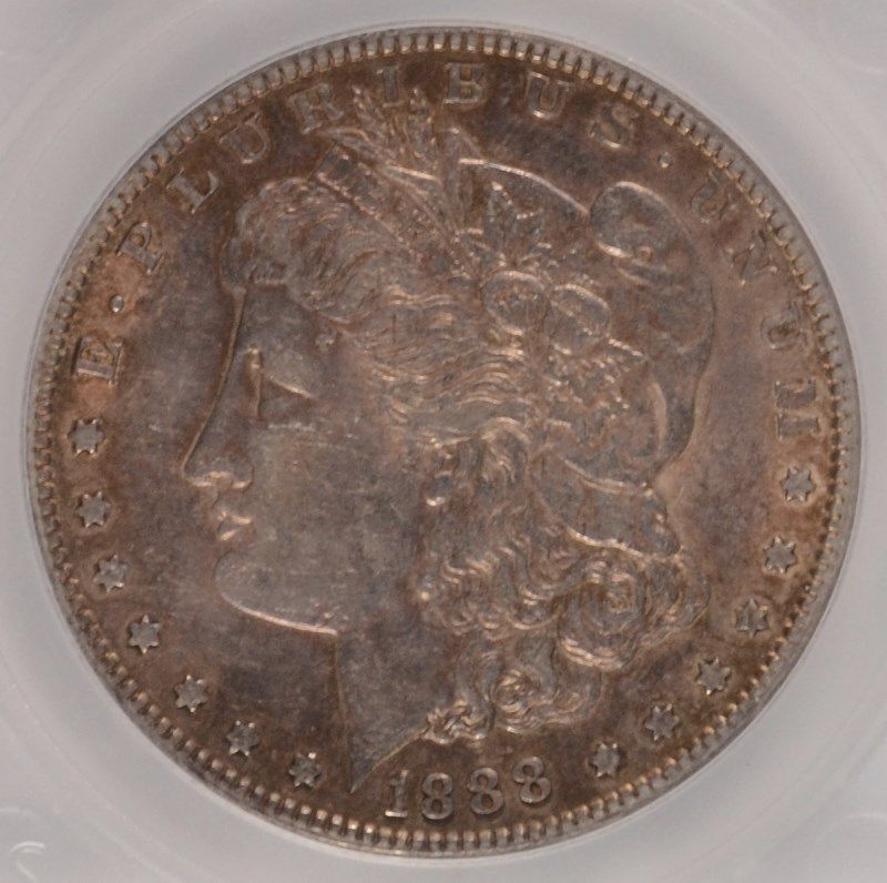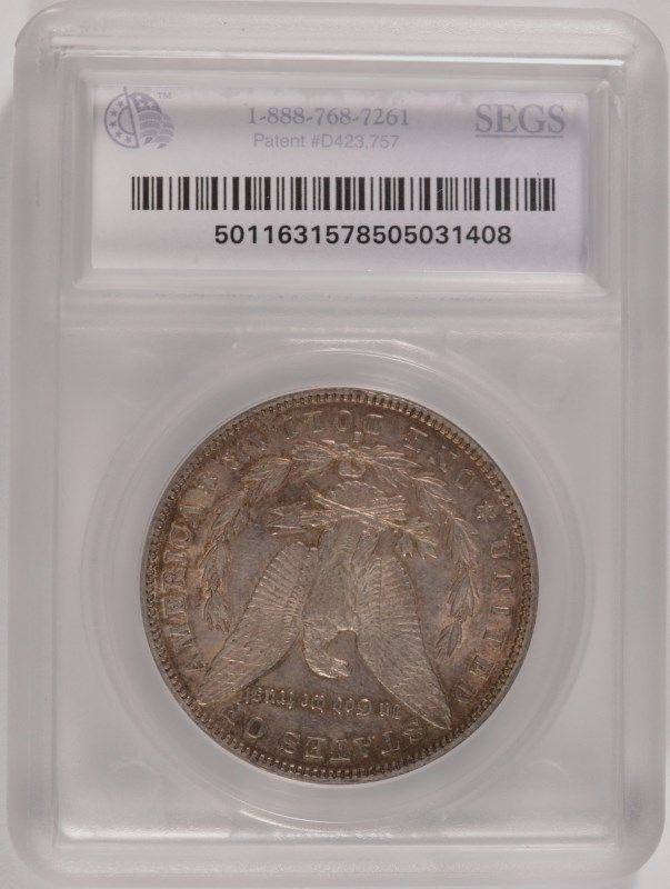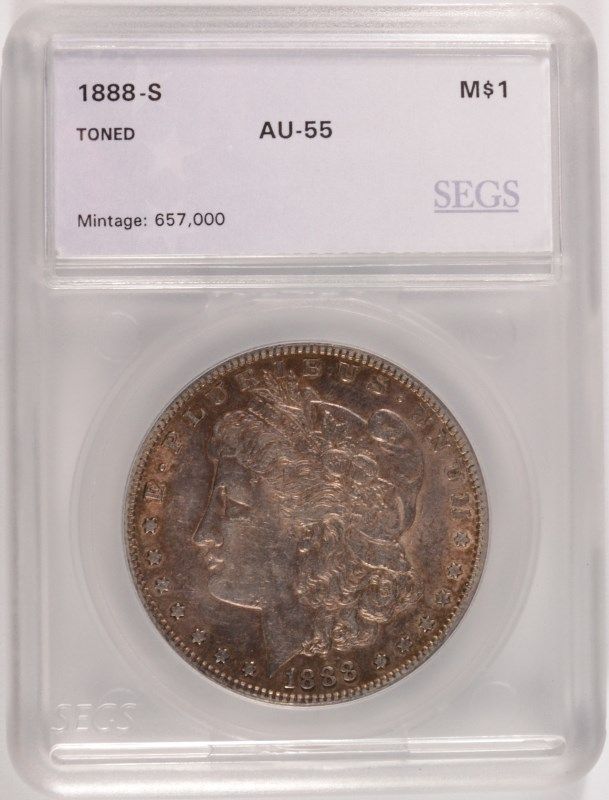 1888-S MORGAN SILVER DOLLAR, SEGS AU-55 COLOR!