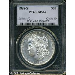 <B>1888-S<img border='0' src='http://www.heritagecoins.com/images/star.gif' width=10 height=10>$1 MS64 PCGS.</B></I> Fully brilliant and sharply struck with exceptional eye appeal. There is no indication of toning on either side. This is a scarce date that is only occasionally found nicer. Lot:10274