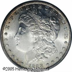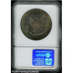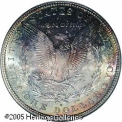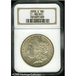 <B>1888-S<img border='0' src='http://www.heritagecoins.com/images/star.gif' width=10 height=10>$1 MS65 NGC.</B></I> The obverse displays a thin veil of lilac colored iridescence that deepens somewhat to olive shades about the rims. In stark contrast, the reverse is deeply toned in antique-russet shades with multicolored swirls intermingled throughout. A lovely coin from the standpoint of originality, the 1888-S is also a prized commodity with sharply struck, pristine features. Lot:10279