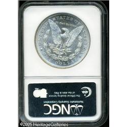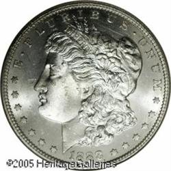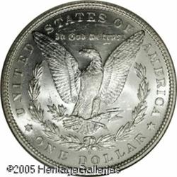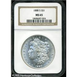<B>1888-S<img border='0' src='http://www.heritagecoins.com/images/star.gif' width=10 height=10>$1 MS65 NGC.</B></I> This coin is totally white in color and very lustrous. The strike is typical for this issue, with slight weakness over Liberty's ear. The surfaces are much finer than normally encountered and just a small group have earned the grade seen here. Population: 70 in 65, 8 finer (1/05). Lot:10280
