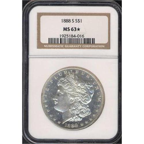 <b>1888-S Morgan Dollar. NGC graded MS63 Star Designation for Eye Appeal.</b> Especially vibrant silvery white luster covers both sides with a slightly prooflike surface in the fields capped off by satiny devices <b>(PCGS # 7186)</b>