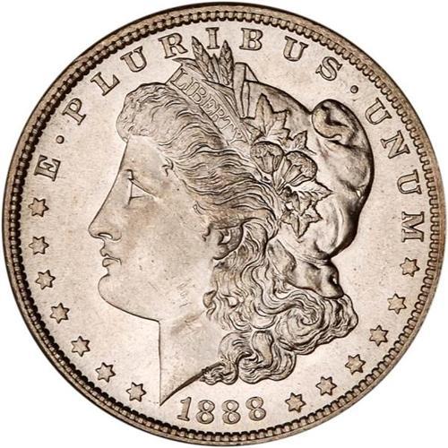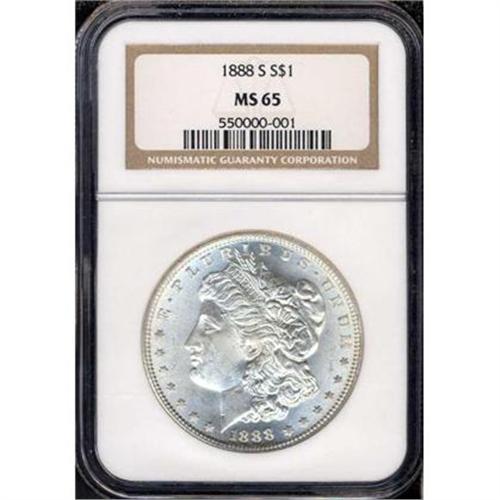 <b>1888-S Morgan Dollar. NGC graded MS65.</b> The surfaces seem to dance from side to side with boiling silvery color, and quite lustrous. For their part, the devices were struck with enough power by the dies that all design elements show completely on this gem specimen of the '88-S low mintage date <b>(PCGS # 7186)</b> <i>