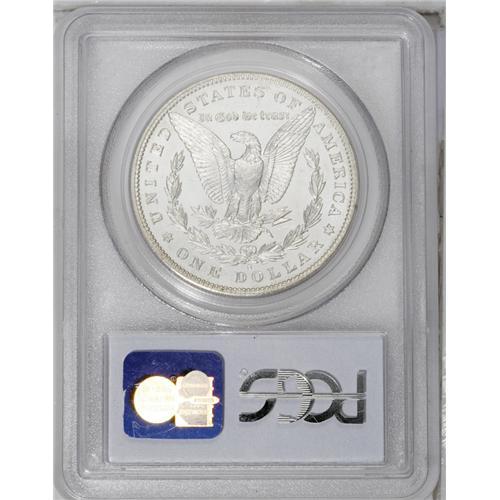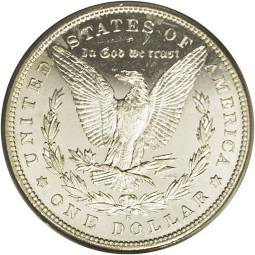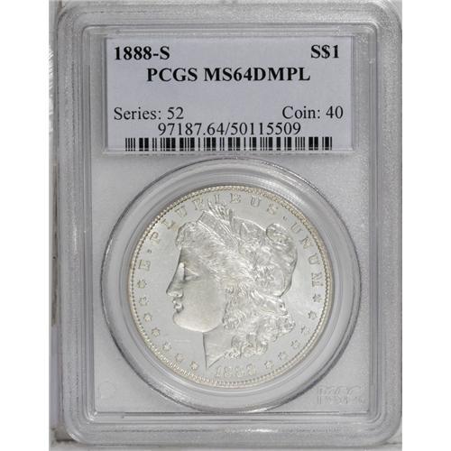 <B>1888-S<img border='0' src='http://www.heritagecoins.com/images/star.gif' width=10 height=10>$1> MS64 Deep Mirror Prooflike PCGS.</B></I> This pinpoint-sharp near-Gem is brilliant aside from a trace of gold on the cheek. The fields are impressively reflective, and the cheek is smooth. A small strike-through rests beneath the L in PLURIBUS. The 1888-S is seldom encountered with both mirrored fields and pleasing surfaces. Population: 38 in 64, 4 finer (7/06).<BR><I>From The New York Eye Appeal Collection.</B></I>