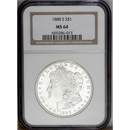 <B>1888-S<img border='0' src='http://www.heritagecoins.com/images/star.gif' width=10 height=10>$1 MS64 NGC.</B></I> Fully prooflike although not designated as such. Extensive die polishing lines are present on the reverse. Both sides have fully brilliant silver surfaces.