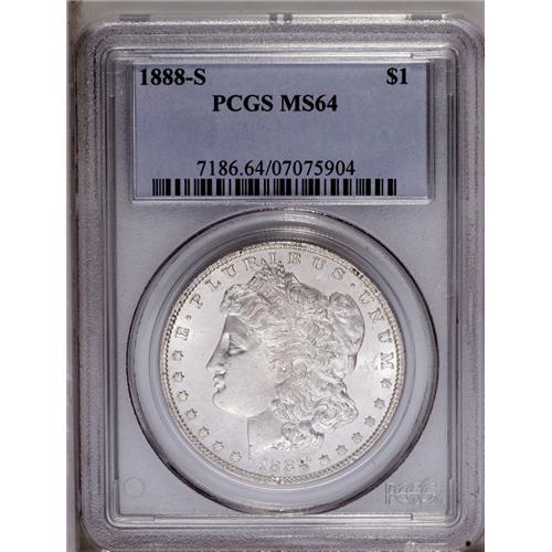 <B>1888-S<img border='0' src='http://www.heritagecoins.com/images/star.gif' width=10 height=10>$1> MS64 PCGS.</B></I> Silver-gray surfaces display pleasing luster, and a few grade-limiting marks, especially on the obverse. The design elements are adequately brought up, though the hair over Liberty's ear is a tad soft. <BR><BR><B>Important notice:</B> Heritage usually auctions material at the rate of 200-250 lots per hour. On some occasions eBay Live bid software or the Internet may not be able to keep up with the pace of the auction. We recommend placing a realistic absentee bid now as insurance to avoid disappointment. Occasionally the auctioneer may eliminate or reject an eBay Live bid, and the auctioneer may also reopen a lot after the close of the eBay live bidding (usually because we missed an audience bid), and may reject your bid even if it shows you as the winning bidder. By bidding via eBay Live, you agree that Heritage may award the lot to another bidder at its sole discretion under the circumstances described above or any other reasonable circumstances. Since eBay bids are not shown to us until we open the lot on the floor, we treat those bids just like floor bids. In most cases the floor responds before the eBay bid is presented to us, due to Internet lag time, so for consistency we have made it a policy that floor bids are always considered first over tie eBay live bids. Also please note that all Heritage lots purchased through eBay Live carry a 20% Buyer's Premium. Please make sure you read the Terms and Conditions before you bid. This lot is being auctioned in conjunction with a live floor auction by Heritage Galleries & Auctioneers. All final auction and invoice information will be supplied by Heritage Galleries & Auctioneers, and all other information should be considered preliminary. Lot:3492 <BR><BR><B>Winning Notification and Billing:</B> After the FINAL session in this auction is complete, Heritage will send e-mail and snail mail invoices. This process normally takes several days. All final auction and invoice information will be supplied by Heritage Galleries & Auctioneers, and all other information should be considered preliminary. <BR><BR>This auction will be conducted on a live auction floor and over the Internet through eBay Live. If you choose to place an absentee bid, please take a moment to <font color='#0000ff'><u><a href='http://pages.ebay.com/liveauctions/help/before/laabsentee.html'>learn how eBay Live absentee bidding works</a></u></font><font color='#000000'>