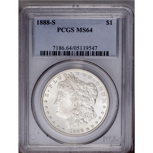 <B>1888-S<img border='0' src='http://www.heritagecoins.com/images/star.gif' width=10 height=10>$1> MS64 PCGS.</B></I> This lightly toned and lustrous better date silver dollar is well preserved from a technical viewpoint, although the centers show some softness and parallel roller marks (as made) cross the lower cheek. <BR><BR><B>Important notice:</B> Heritage usually auctions material at the rate of 200-250 lots per hour. On some occasions eBay Live bid software or the Internet may not be able to keep up with the pace of the auction. We recommend placing a realistic absentee bid now as insurance to avoid disappointment. Occasionally the auctioneer may eliminate or reject an eBay Live bid, and the auctioneer may also reopen a lot after the close of the eBay live bidding (usually because we missed an audience bid), and may reject your bid even if it shows you as the winning bidder. By bidding via eBay Live, you agree that Heritage may award the lot to another bidder at its sole discretion under the circumstances described above or any other reasonable circumstances. Since eBay bids are not shown to us until we open the lot on the floor, we treat those bids just like floor bids. In most cases the floor responds before the eBay bid is presented to us, due to Internet lag time, so for consistency we have made it a policy that floor bids are always considered first over tie eBay live bids. Also please note that all Heritage lots purchased through eBay Live carry a 20% Buyer's Premium. Please make sure you read the Terms and Conditions before you bid. This lot is being auctioned in conjunction with a live floor auction by Heritage Galleries & Auctioneers. All final auction and invoice information will be supplied by Heritage Galleries & Auctioneers, and all other information should be considered preliminary. Lot:3493 <BR><BR><B>Winning Notification and Billing:</B> After the FINAL session in this auction is complete, Heritage will send e-mail and snail mail invoices. This process normally takes several days. All final auction and invoice information will be supplied by Heritage Galleries & Auctioneers, and all other information should be considered preliminary. <BR><BR>This auction will be conducted on a live auction floor and over the Internet through eBay Live. If you choose to place an absentee bid, please take a moment to <font color='#0000ff'><u><a href='http://pages.ebay.com/liveauctions/help/before/laabsentee.html'>learn how eBay Live absentee bidding works</a></u></font><font color='#000000'>