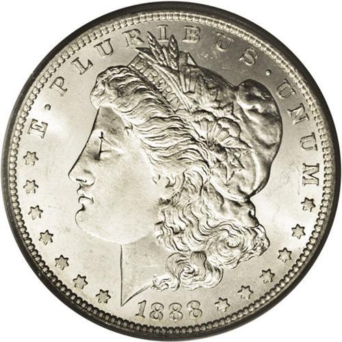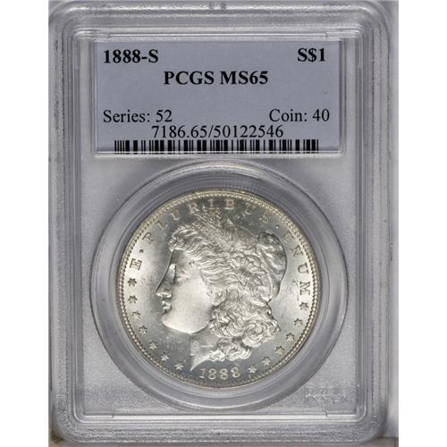 <B>1888-S<img border='0' src='http://www.heritagecoins.com/images/star.gif' width=10 height=10>$1> MS65 PCGS.</B></I> Bright and lustrous with an essentially untoned appearance over the entire coin. Great quality for this date. We note a few minor scratches on Liberty's neck, but these are minor given the overall quality and scarcity of this date in Gem grades. Population: 185 in 65, 19 finer (6/06).<BR><I>From The Chicago-Ark Collection.</B></I>