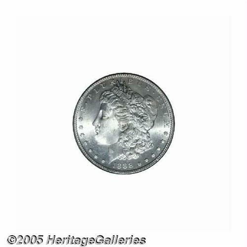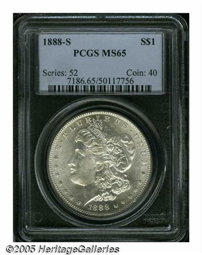 <B>1888-S<S$1> MS65 PCGS.</B></I> With a relatively low mintage of 657,000 pieces struck, the '88-S Morgan Dollar is moderately scarce in finer grades of Mint State. This example displays a nearly brilliant obverse, while the reverse shows a barely discernible whisper of light tan in the reverse fields. The design elements are well struck, save for a touch of softness in the hair above Liberty's ear. A few minute marks on Liberty's cheek and neck and on the eagle's breast are mentioned for accuracy. Population: 167 in 65, 19 finer (6/05).