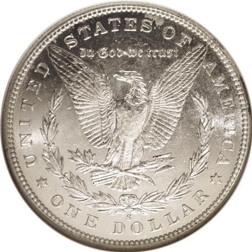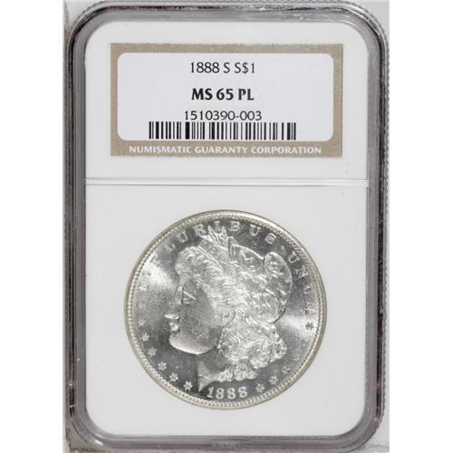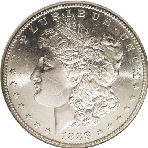 <B>1888-S<img border='0' src='http://www.heritagecoins.com/images/star.gif' width=10 height=10>$1> MS65 Prooflike NGC.</B></I> A flashy and essentially untoned example with excellent detail. Only a few small marks appear in the remarkably clean fields. Prooflike examples are elusive for this issue, and a Prooflike Gem is harder still. Census: 6 in 65 Prooflike, 0 finer (7/06).