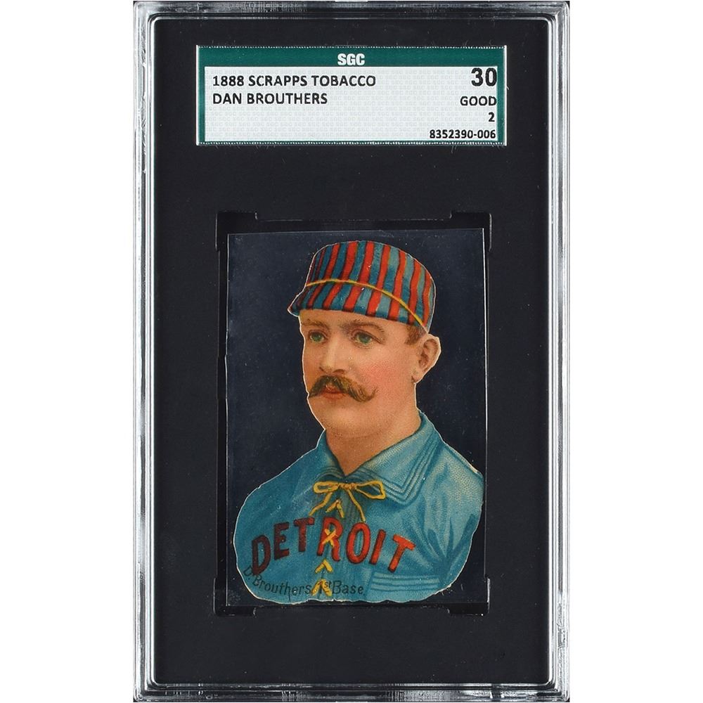 Graded by SGC GOOD 2. The fragility of the card makes it one of the most difficult issues to obtain in high grade, as these 'die-cut' Scrapps cards are paper-based (not cardboard) and were manufactured to be glued in scrapbooks, hence the name Scrapps. The die-cut nature leads the cards to be susceptible to creasing and/or tears at the neck area. Cards were issued for the two league champions—the Detroit Wolverines and St. Louis Browns—with this example of HOFer Dan Brouthers being free of creasing and tears, with the only blemish a half-inch stain on the verso, which is barely noticeable on the front. One very minor chip appears on the left shoulder of Brouthers, with nary any other faults.