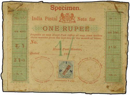 1888 Trial Speciment from the Postmaster issued on card headed INDIA POSTAL NOTE FOR ONE RUPEE and cancelled surcharge 1/- bearing India 1 r grey (SG 79) overprinted I.P.N SPECIMEN in red. Very fine and scarce item.