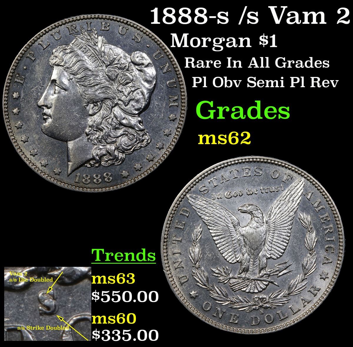 1888-s /s Vam 2 Morgan Dollar $1 Grades Select Unc. Up for auction is a wild and very interesting 1888-s/s Morgan. It is the Vam 2 which has a doubled s/s, but what makes this coin very interesting is that it also has a wild Strike doubled s/s mintmark!. Both Die Doubled and Strike doubled! The Vam 2 is a R5 variety and this coin also has a PL Obverse. Great coin to own.