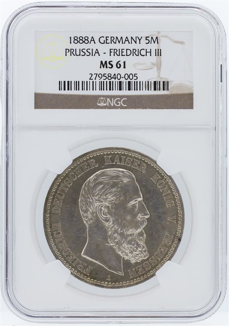 One 1888A NGC MS61 Germany 5M Prussia - Friedrich III Coin. NGC Certified.