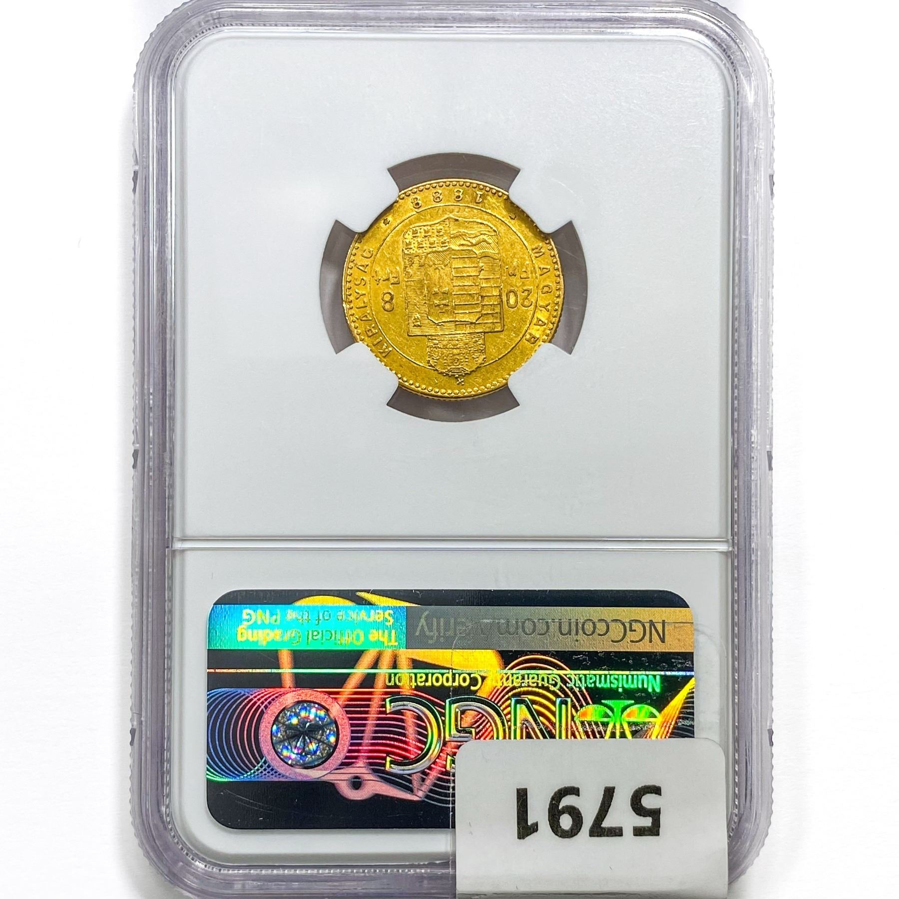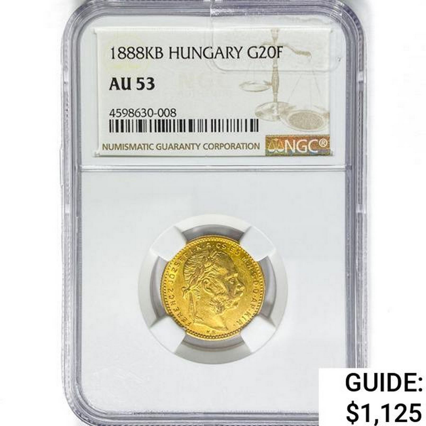 1888KB Hungary .1867oz. Gold 20 Francs NGC AU53