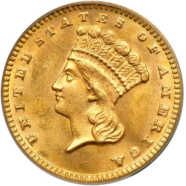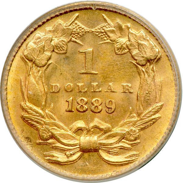 1889 $1 Gold Indian. PCGS graded MS-64. CAC Approved. Nice golden toning. Only 28,950 struck and virtually in the gem class with its outstanding satiny frost (PCGS # 7590) .