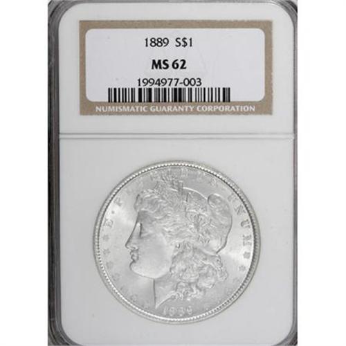<B>1889 $1 MS62 NGC.</B></I> . NGC Census: (1005/18529). PCGS Population (1734/14427). Mintage: 21,726,812. Numismedia Wsl. Price for NGC/PCGS coin in MS62: $31. (#7188)<BR><BR><B>Coin Engraver:</B> George T. Morgan<BR><BR><b>Shipping:</b> Coins & Currency (<a target="_blank" href="http://www.heritageauctions.com/common/shipping.php">view shipping information</a>)