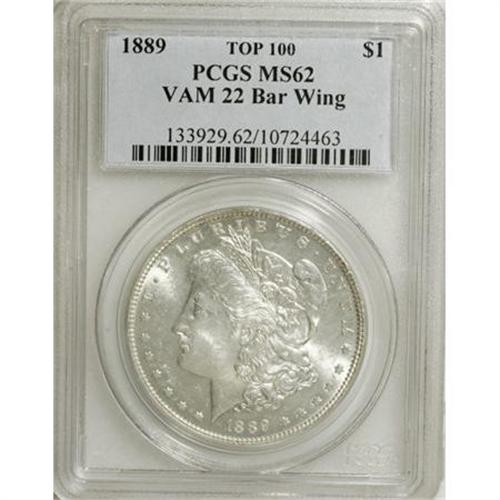 <B></B></I> <B>1889 $1 MS62 PCGS.</B></I> VAM 22, Bar Wing. A Top 100 Variety. PCGS Population (4/10). NGC Census: (0/0). (#133929)<BR><BR><b>Shipping:</b> Coins & Currency (<a target="_blank" href="http://www.heritageauctions.com/common/shipping.php">view shipping information</a>)